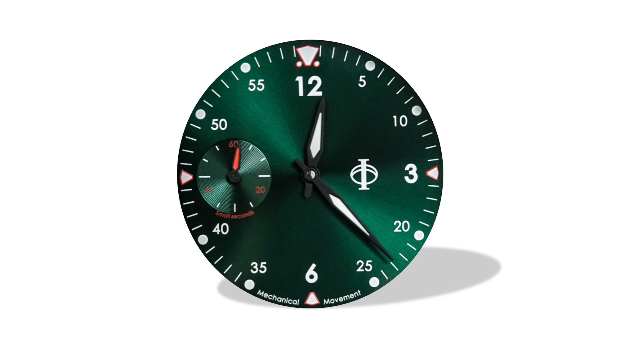 Matte pilot hands (lume filled, black coated) and red small seconds