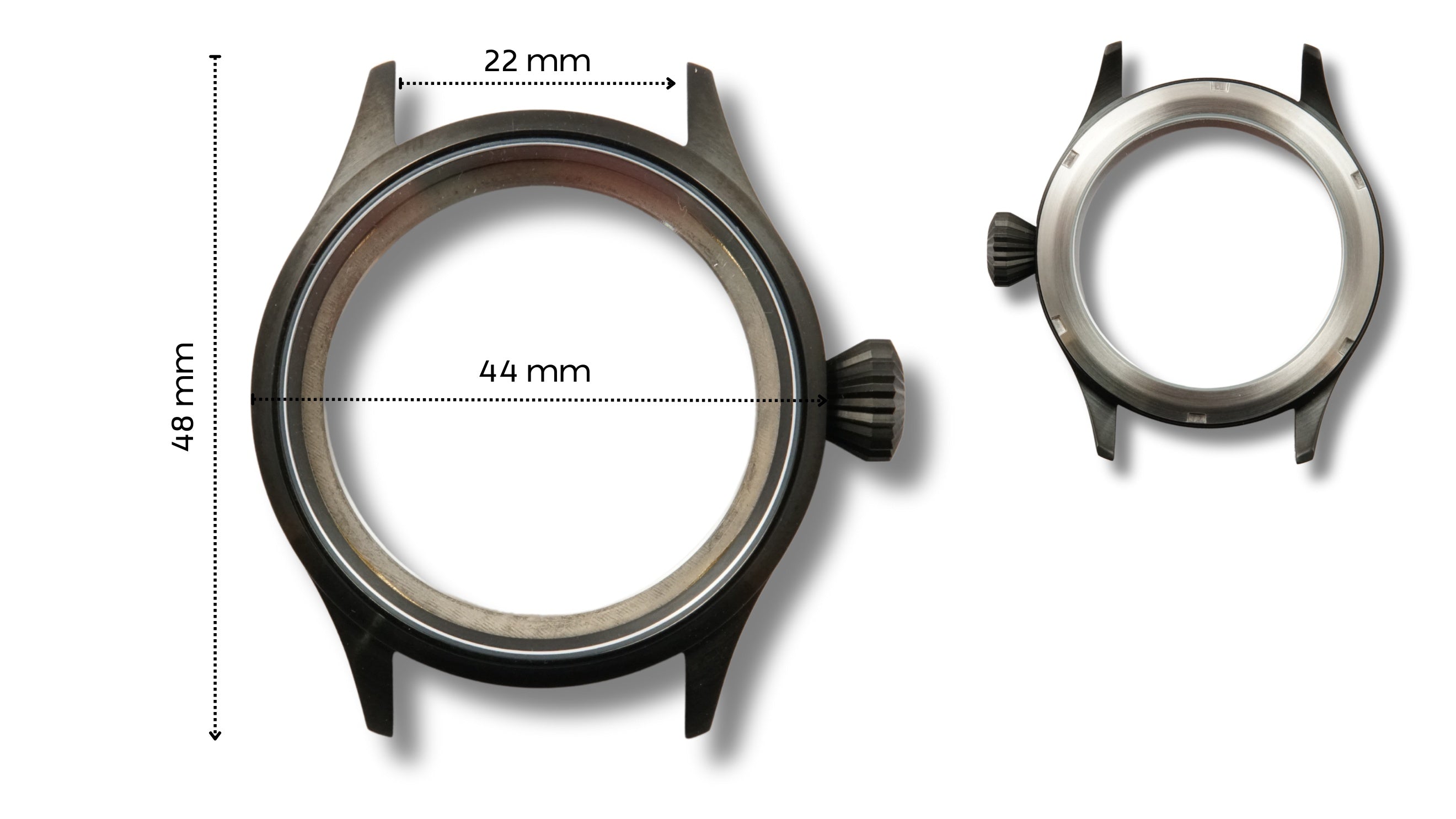 Stainless steel pilot case (44mm size) with see-through case back and over-sized crown (22mm lug size)