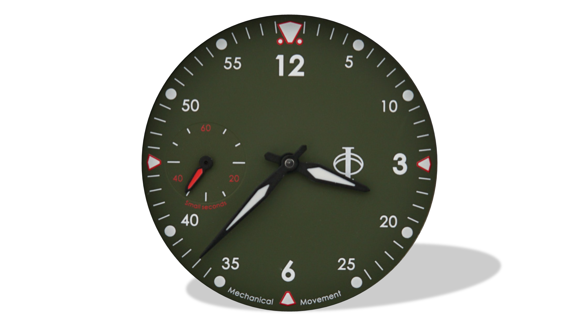 Matte pilot dial with small seconds sub-dial at 9 o'clock (white numerals and hourmarkers printed in lume)