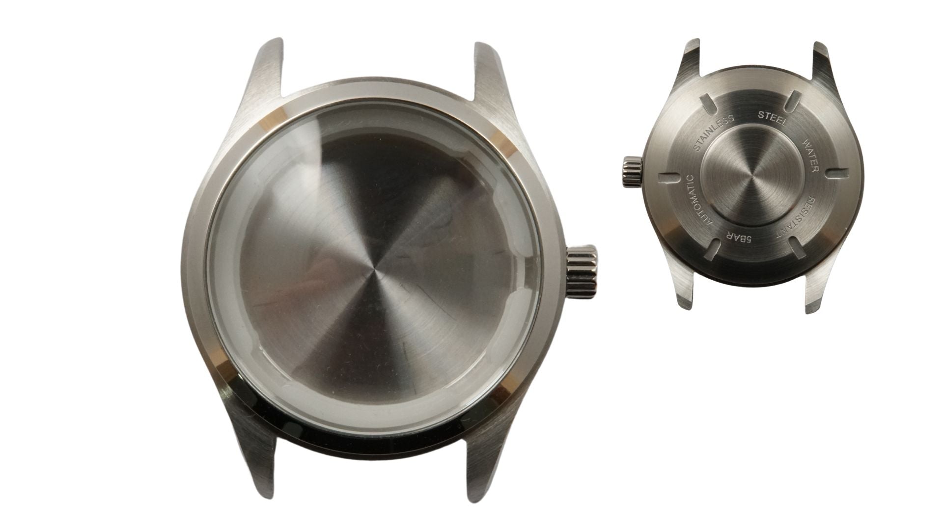 Classic field watch case with brushed surfaces and polished bezel/lug edges. solid case back and water resistant screw down crown (up to 5ATM)