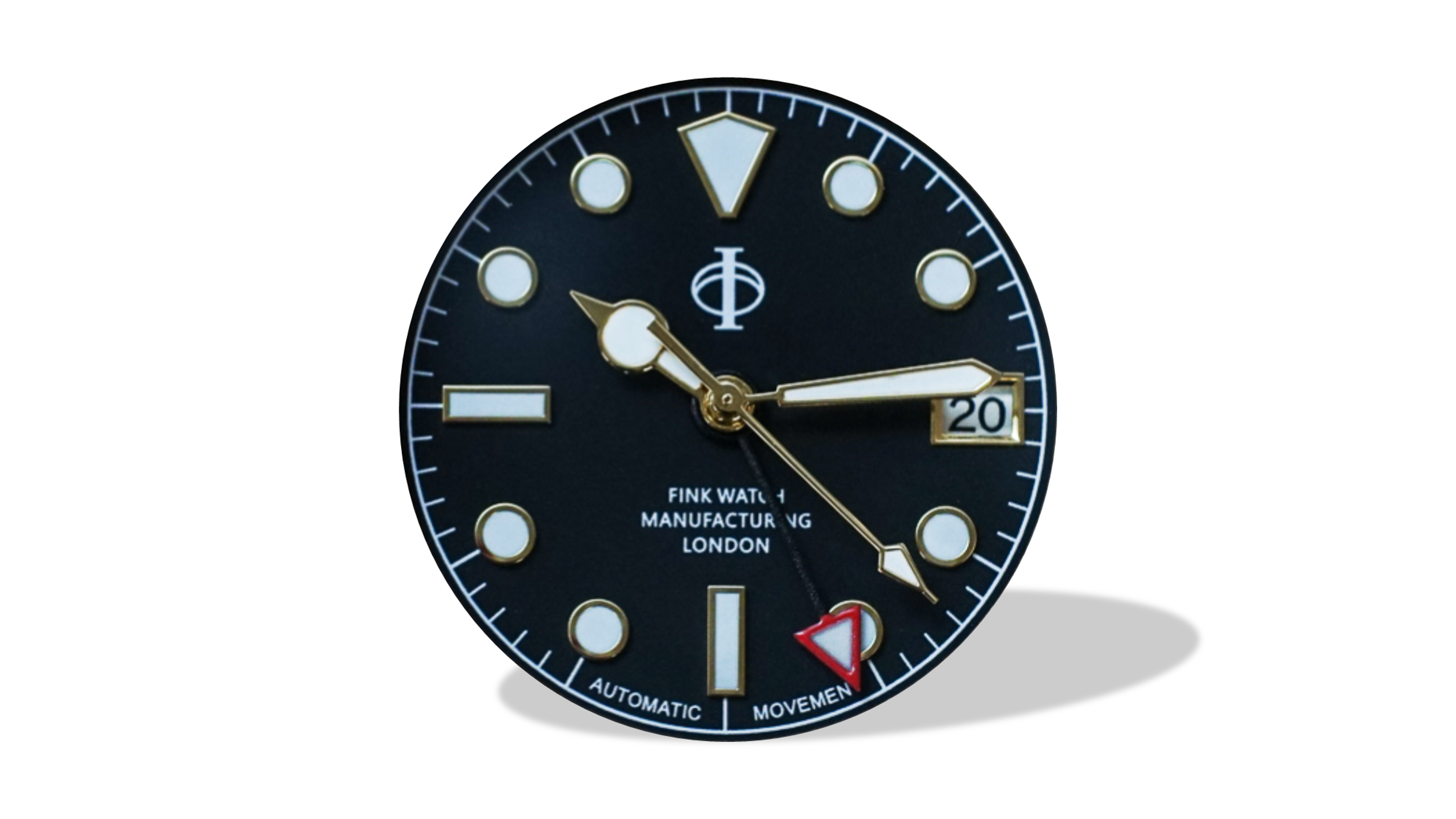 Matte black diver GMT dial with gold colour, polished hour markers (lume filled)