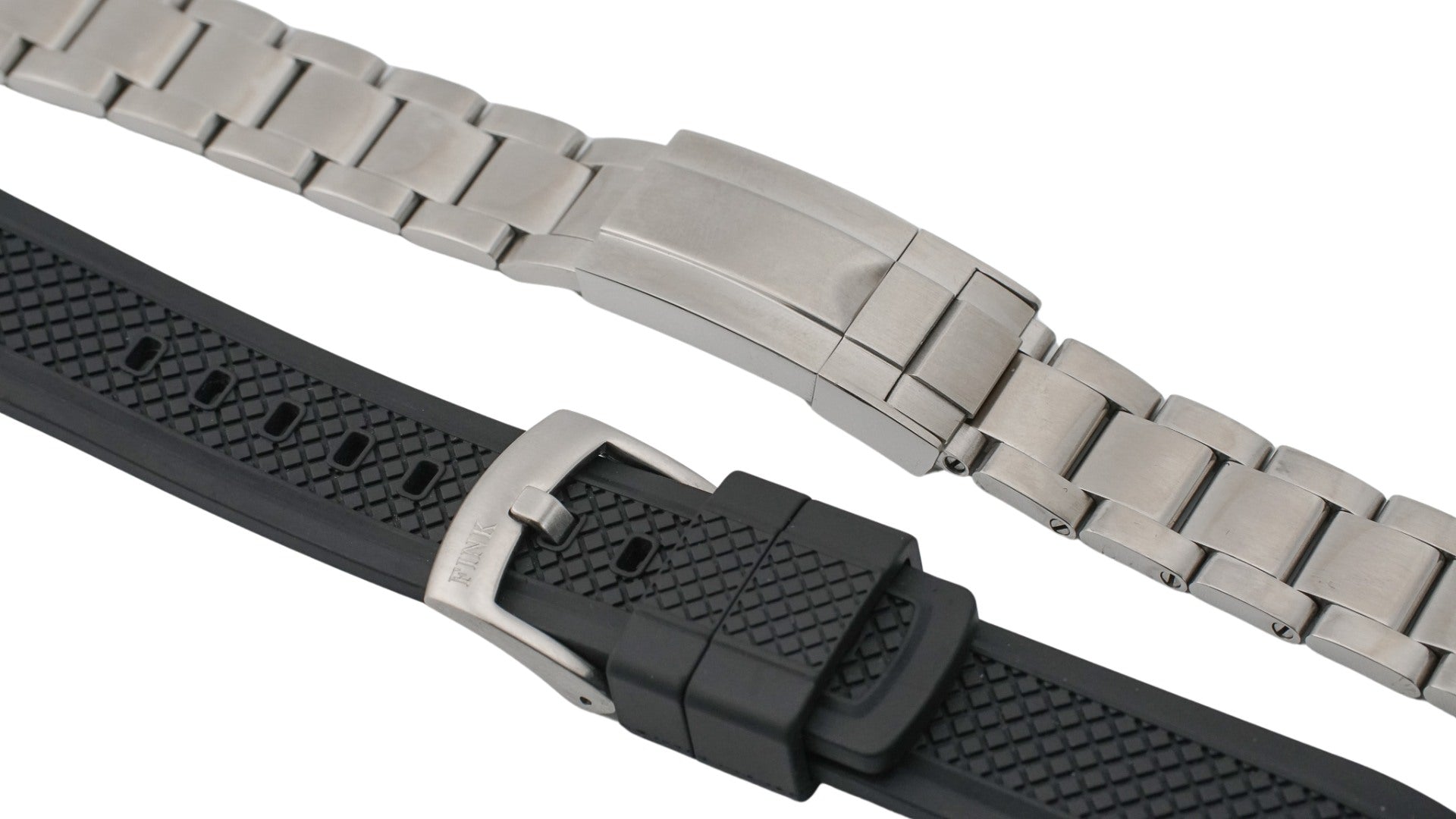 Black FKM rubber strap or stainless steel bracelet with engineered links (both with quick-release spring bars)