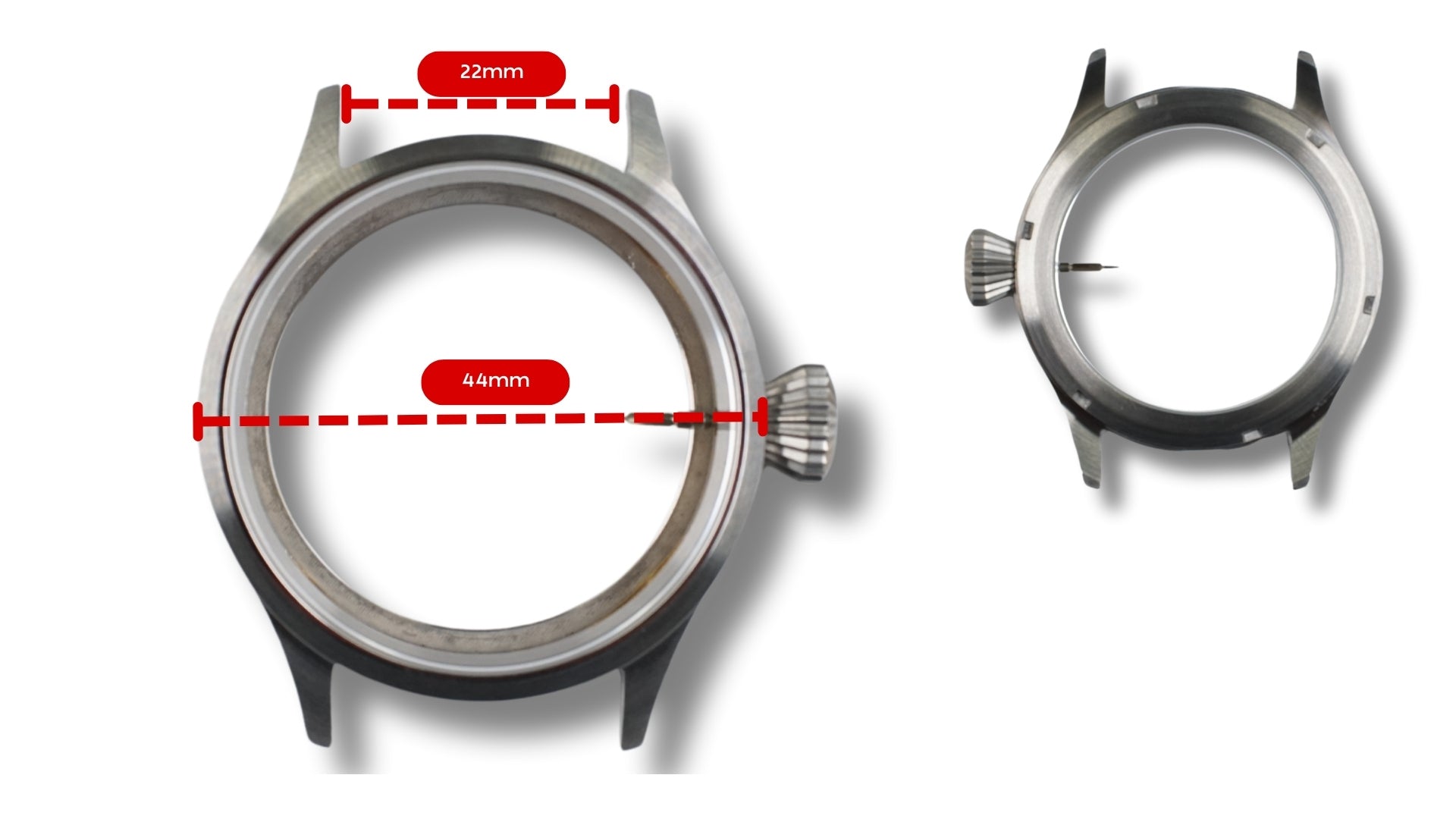Stainless steel pilot case (44mm size) with see-through case back and over-sized crown (22mm lug size)