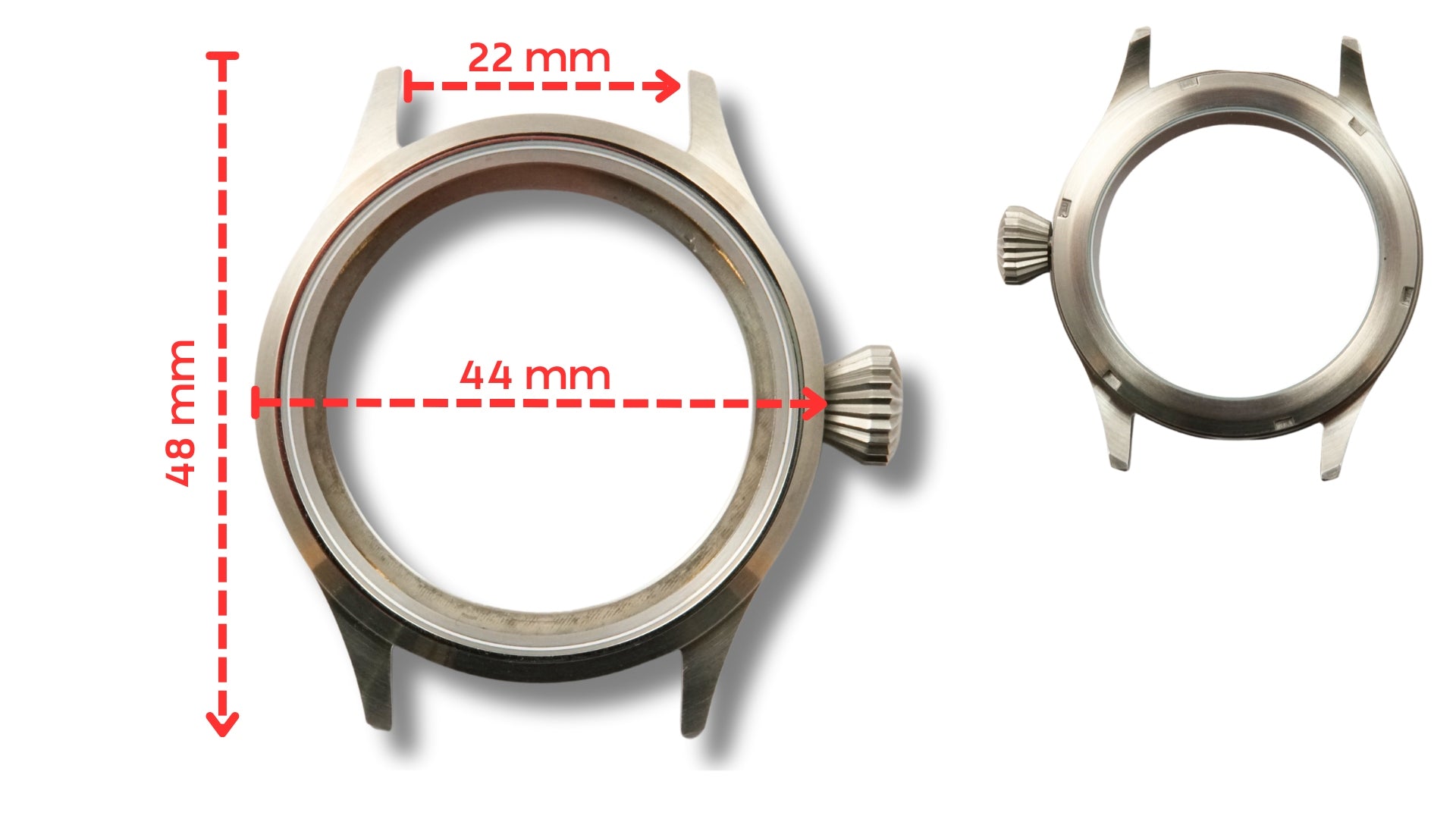 Stainless steel pilot case (44mm size) with see-through case back and over-sized crown (22mm lug size)